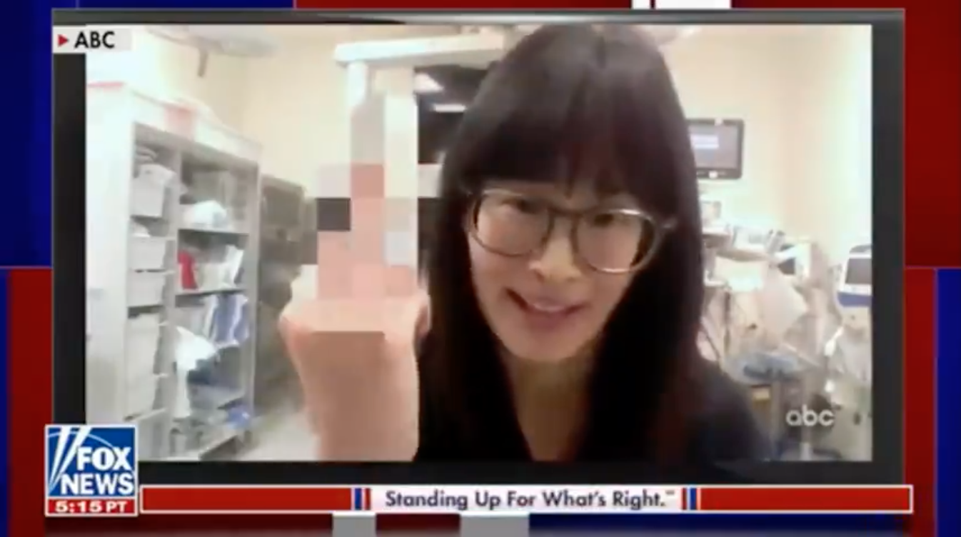 Tucker played a clip from some late night comedy show of supposed nurses and doctors menacing and threatening the audience. One Asiatic (presumably Taiwanese) female nurse said something to the effect of “shut the fuck up and take the shot” and then gave the viewer her middle finger.