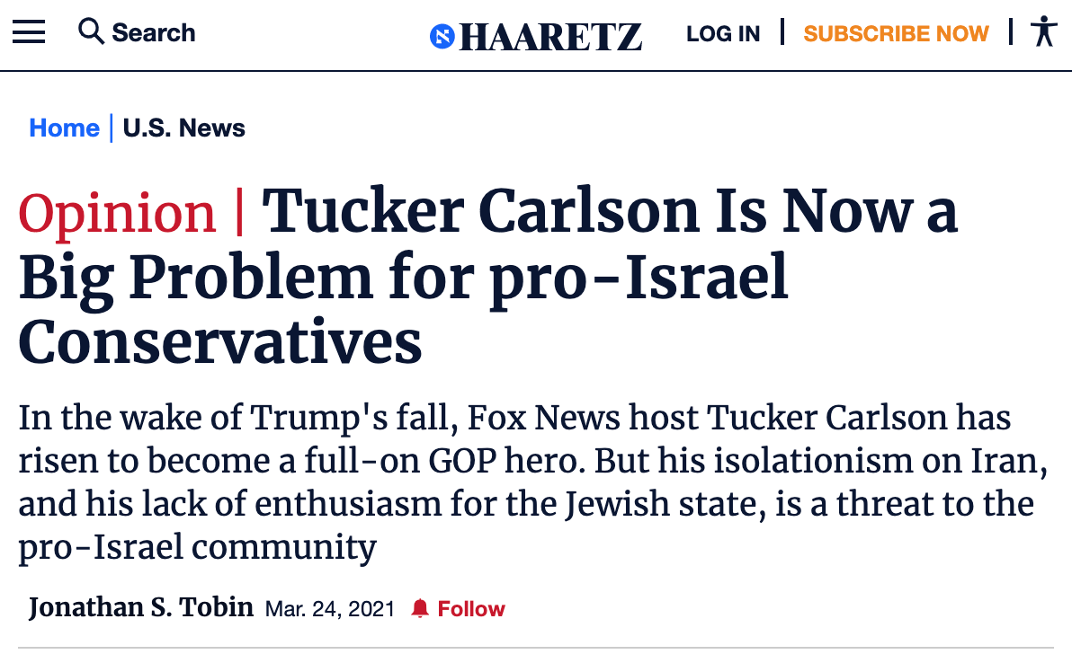 Last month, the Israeli newspaper Haaretz published an article by Jonathan Tobin entitled “Tucker Carlson is Now a Big Problem for pro-Israel Conservatives.”