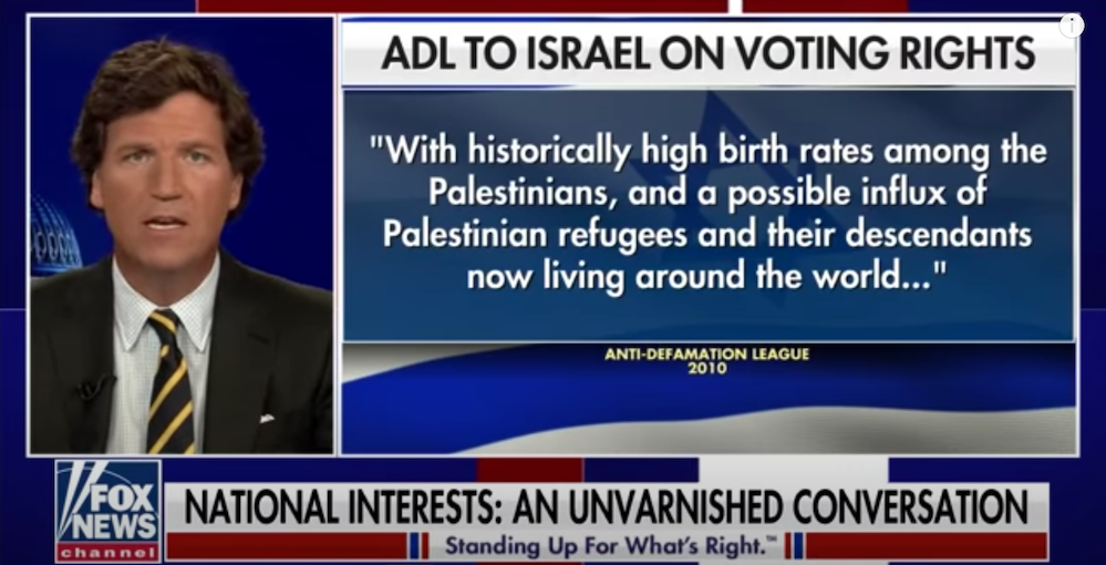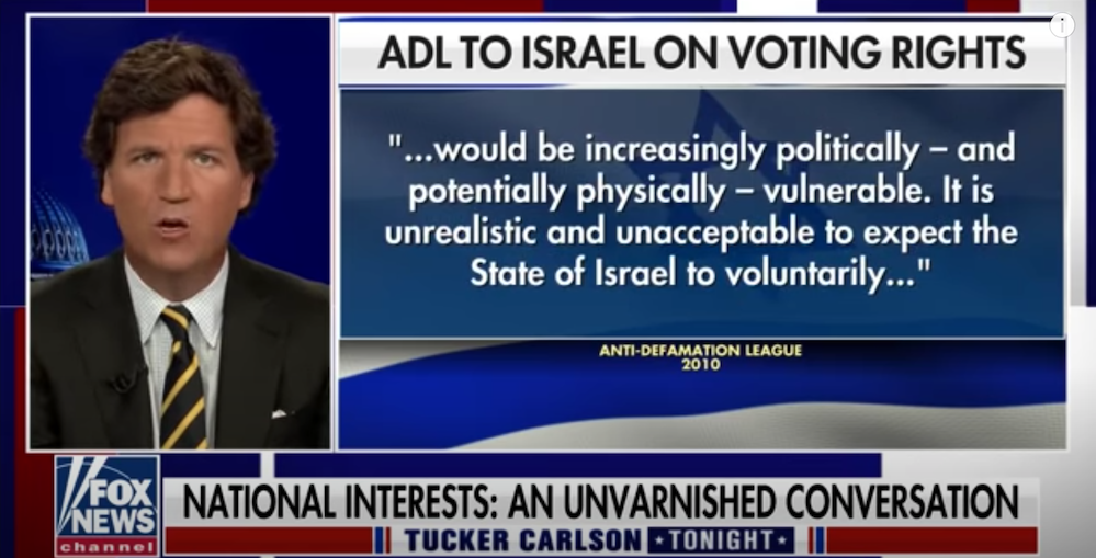 By quoting Israeli policy on immigration, Tucker is laying his cards on the table as well. He is revealing something we all knew: he has the standard right-wing view on Israel: Jews come to America and force us to have unlimited immigration, while in their own country, they have a wall and DNA-based citizenship.