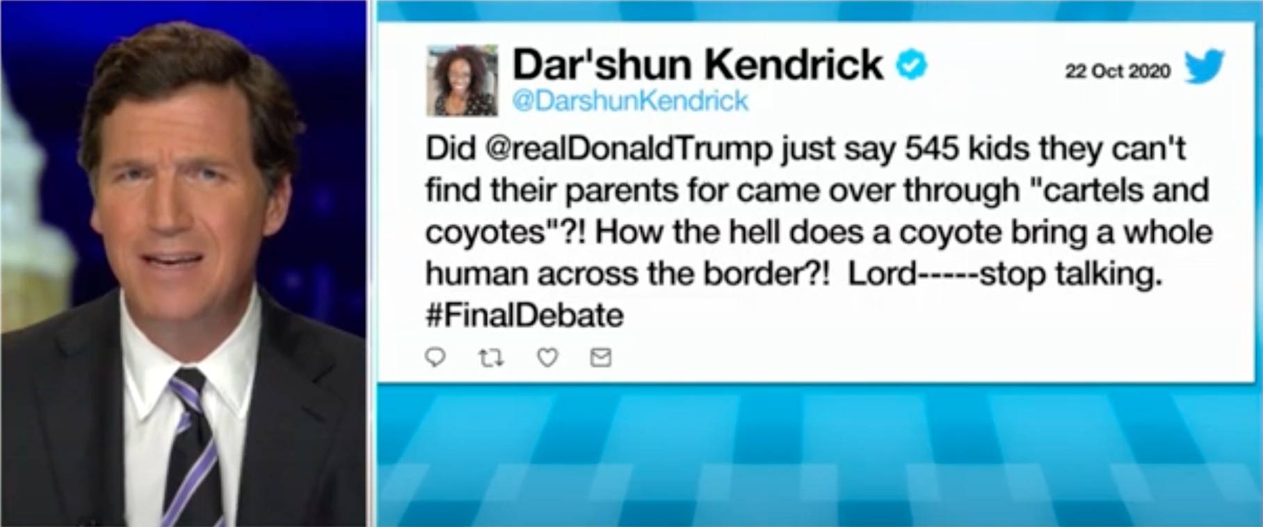 I thought it was pretty darn racist that Tucker posted a tweet from a black woman who thought when Trump talked about “coyotes” taking Mexican children across the border, he meant… the animal.