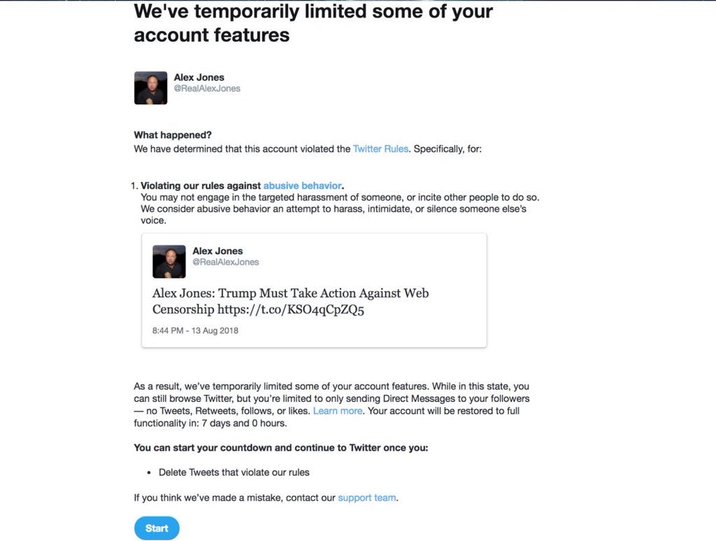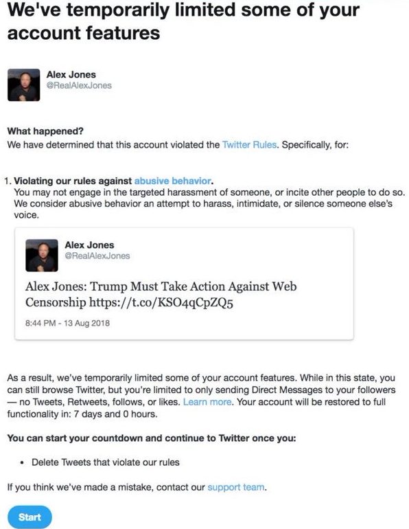 @jack previously refused to go with the flow and ban Alex Jones, now Twitter appears to be testing the waters for a ban with a one week suspension.