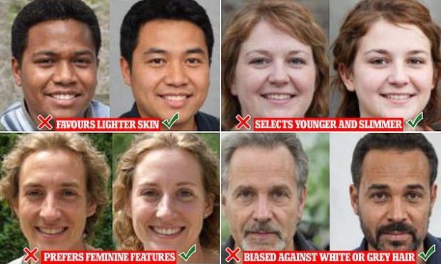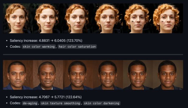 Since the faces were themselves artificial, it was possible to generate faces that were almost identical, but at different points on spectrums of skin tone, width, gender presentation or age – and so demonstrate that the algorithm focused on younger, slimmer and lighter faces over those that were older, wider or darker.