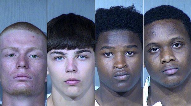 Four men have been arrested in connection with shootings that left one woman dead and a teenage boy seriously hurt, police say. The group was driving around Phoenix on Wednesday morning “looking for homeless people to shoot,” according to court documents.