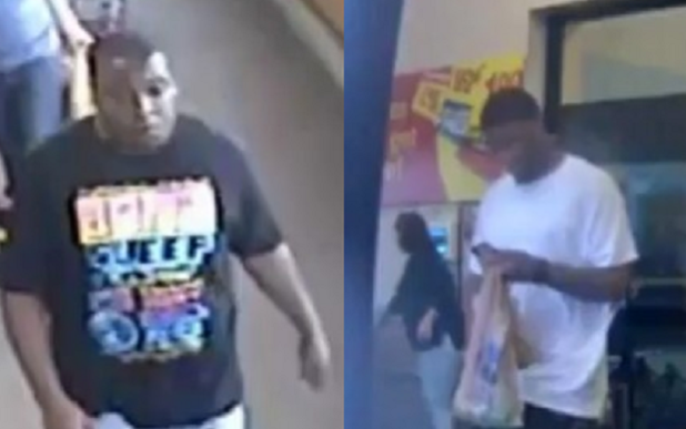 One suspect is described as a medium-build black male with a mustache, goatee and short black hair, wearing a white T-shirt and camouflage pants. The other suspect is described as a slightly chubby, clean-shaven black male with short black hair, wearing patched jeans, a black T-shirt with a design on front and black tennis shoes.