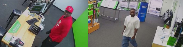 Suspect No. 1 is a black male between 23 and 30 years of age. He is approximately 6-feet, 6-inches tall and weighs between 250 to 300 pounds. He was wearing black gloves, a red Chicago Bulls hat, a red Rockets hoodie, black jogger-style pants and glasses. He also had a skin pigmentation on his lips.