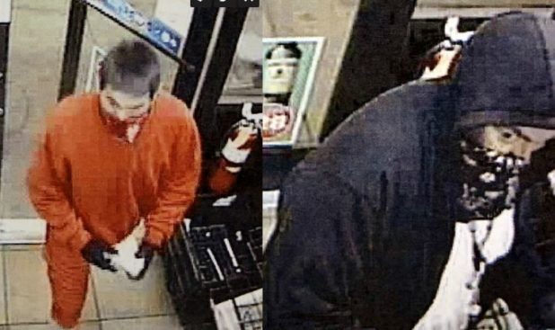 The first suspect is described as a Hispanic male, age not known, medium height and build. He was last seen wearing a red sweatshirt, red shorts, black tennis shoes and a red bandana over his face.