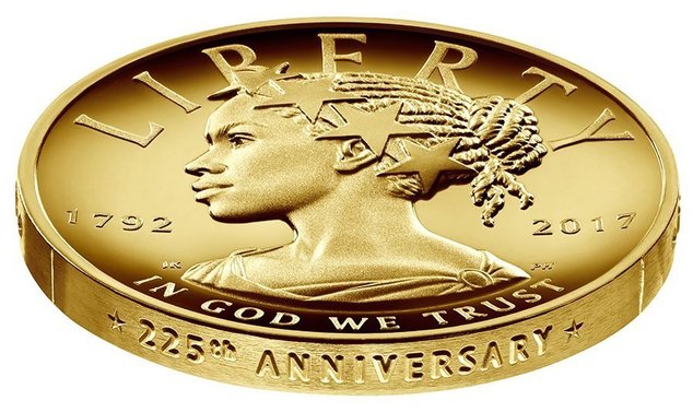 The 2017 American Liberty 225th Anniversary Gold Coin shows the woman’s head in profile with a crown of stars.