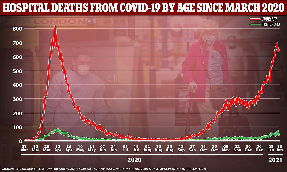NHS England data shows 56,000 Covid deaths were recorded in over-60s by January 14 — but only 4,500 in the under-60s.