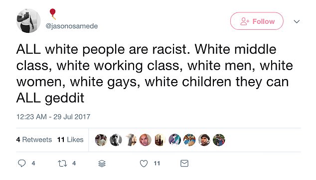 Okundaye, 20, wrote to his thousands of Twitter followers: ‘ALL white people are racist. White middle class, white working class, white men, white women, white gays, white children they can ALL geddit.’
