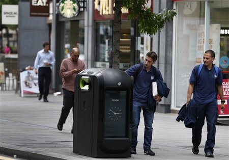 Officials demanded Monday that an advertising firm stop using a network of high-tech trash cans to track people walking through London’s financial district.