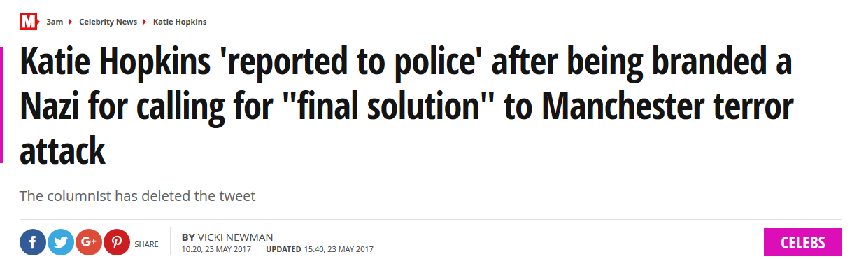 Holocaust educators have condemned controversial Daily Mail columnist Katie Hopkins for tweeting about the ‘final solution’ in response to the Manchester terror attack.