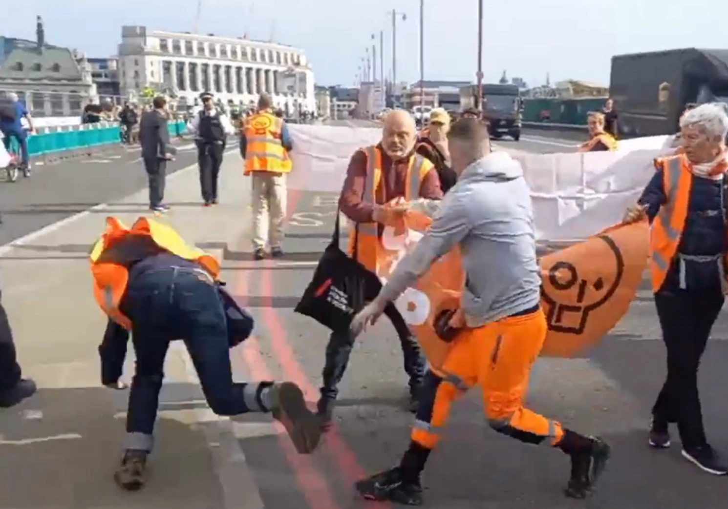 A scaffolder who shoved Just Stop Oil protesters in a bid to clear the road has had his legal case dropped after eight months.