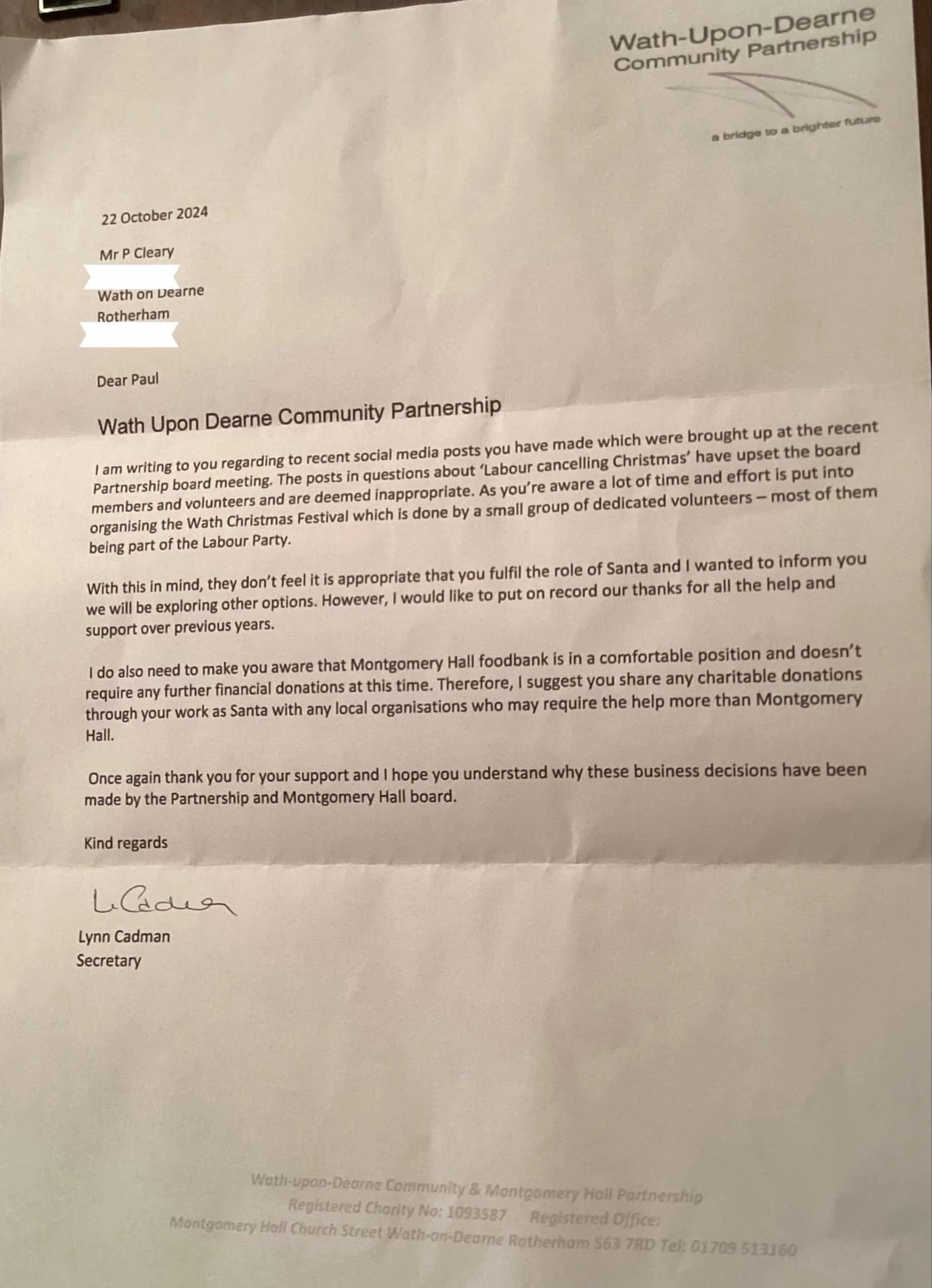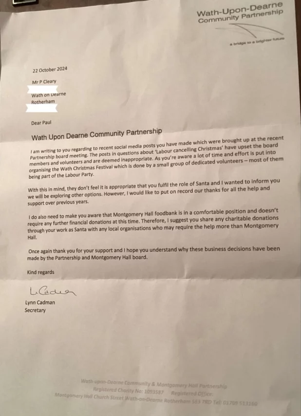 The letter noted that many of the Christmas Festival organisers were Labour Party members and that his views meant it was therefore no longer “appropriate” for him to fulfil the role of Santa Claus.