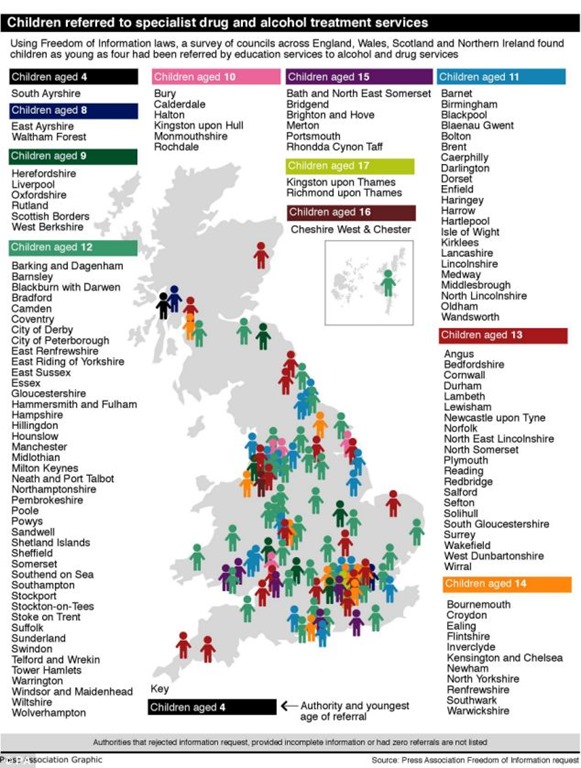 Children as young as four are among hundreds of youngsters being referred to specialist drug and alcohol treatment services in the UK.