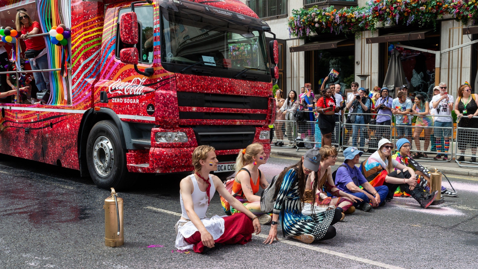 The green activists used their typical tactic of laying down on the road to stop the march, choosing to block the float sponsored by Coca-Cola over its role in plastic pollution.