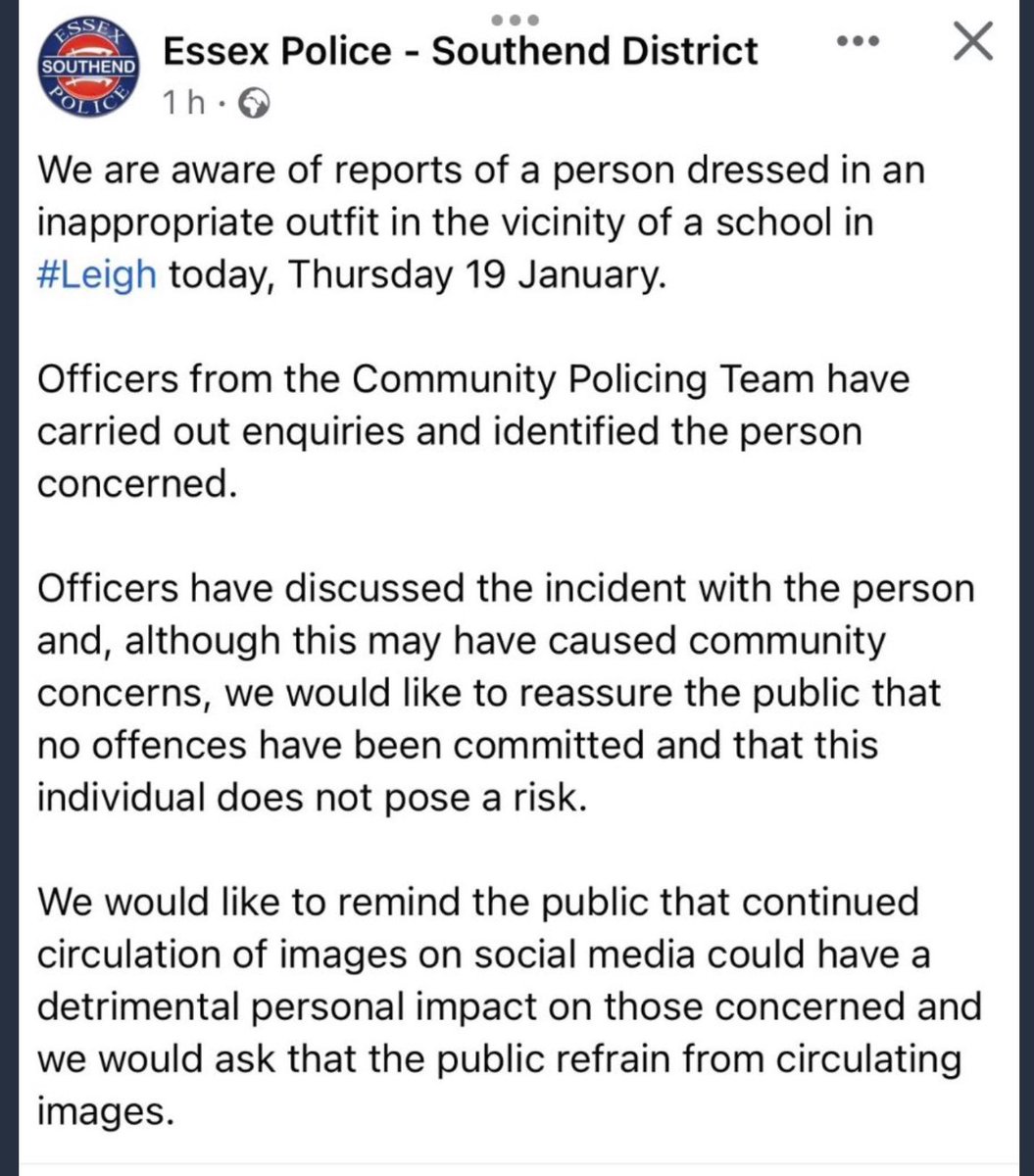 Essex Police have asked we stop circulating images of this man (dressed in a schoolgirls uniform and hanging about the gates of the school) because they have spoken to him and he’s not posing any risk! Circulating his image may cause him distress apparently. Circulate away. https://t.co/BDMjgcEs9M
