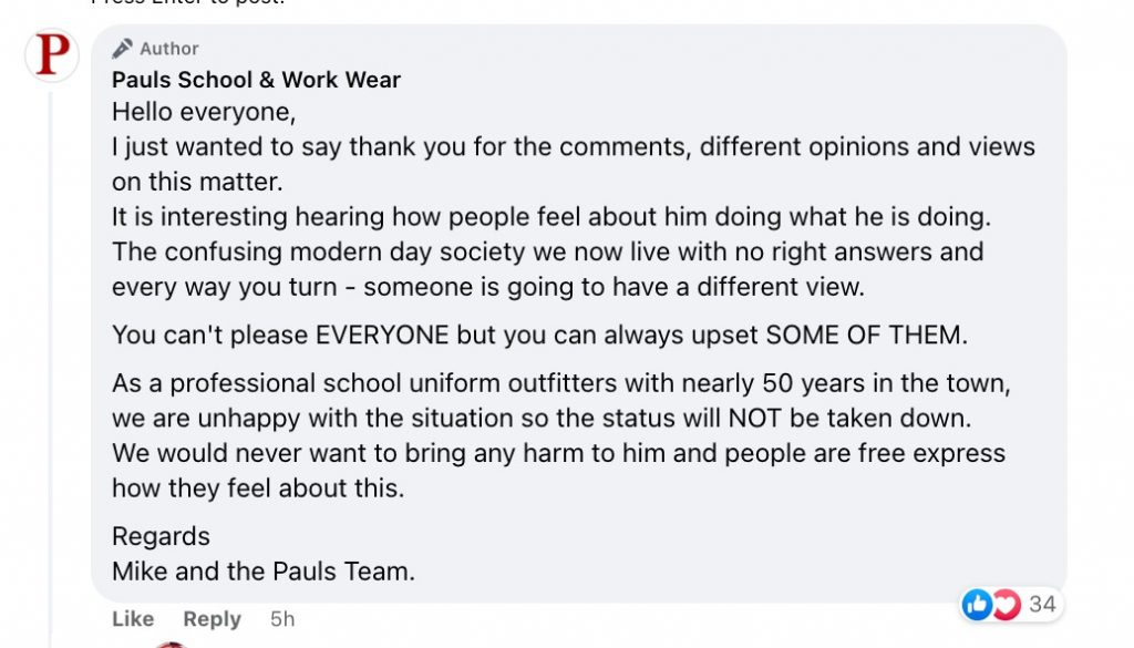 Paul’s School and Workwear even addressed those who were defending the man’s behavior and added a comment to their own post.