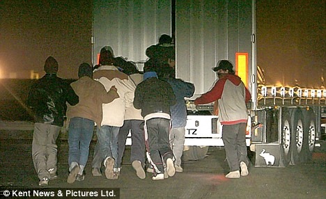 ILLEGAL immigrants in Calais scramble desperately to get aboard a moving lorry as it heads for a ferry bound for England.