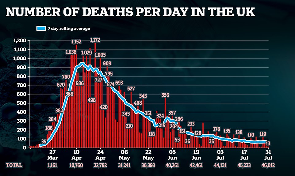 Mr Johnson had planned to reopen casinos, bowling alleys and allow crowds at live sporting events by August 1. But that has been pushed back to August 15 ‘at the earliest’ amid an uptick in infections across the country.