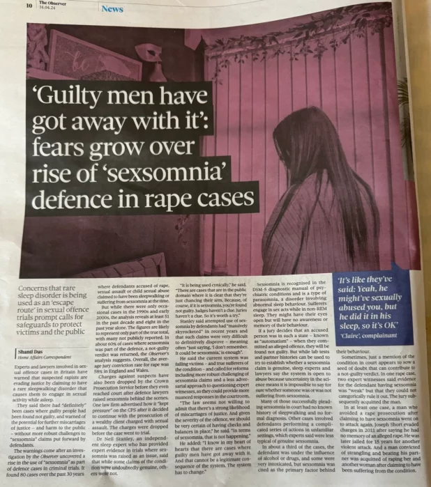 The warnings come after an investigation by the Observer uncovered a rise in the use of “sexsomnia” as part of defence cases in criminal trials. It found 80 cases over the past 30 years where defendants accused of rape, sexual assault or child sexual abuse claimed to have been sleepwalking or suffering from sexsomnia at the time.
