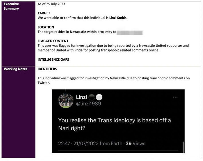 The Premier League has been accused of using “Stasi” tactics after an 11-page dossier of social media posts and other information on Newcastle United supporter Linzi Smith was reportedly used to ban her from attending matches until at least 2026 and was even handed over to the police in an apparent attempt to have her arrested over social media posts rejecting modern gender theories.