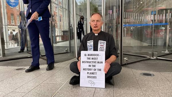 The priest was also seen holding placards saying “Murdoch to the dock for ecocide” and “The Murdoch legacy? The 6th Mass Extinction on planet earth.”