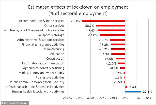 Accommodation and food services are predicted to suffer the worst rate of cuts, with 75.1 per cent of jobs lost, or around 1.3million positions.