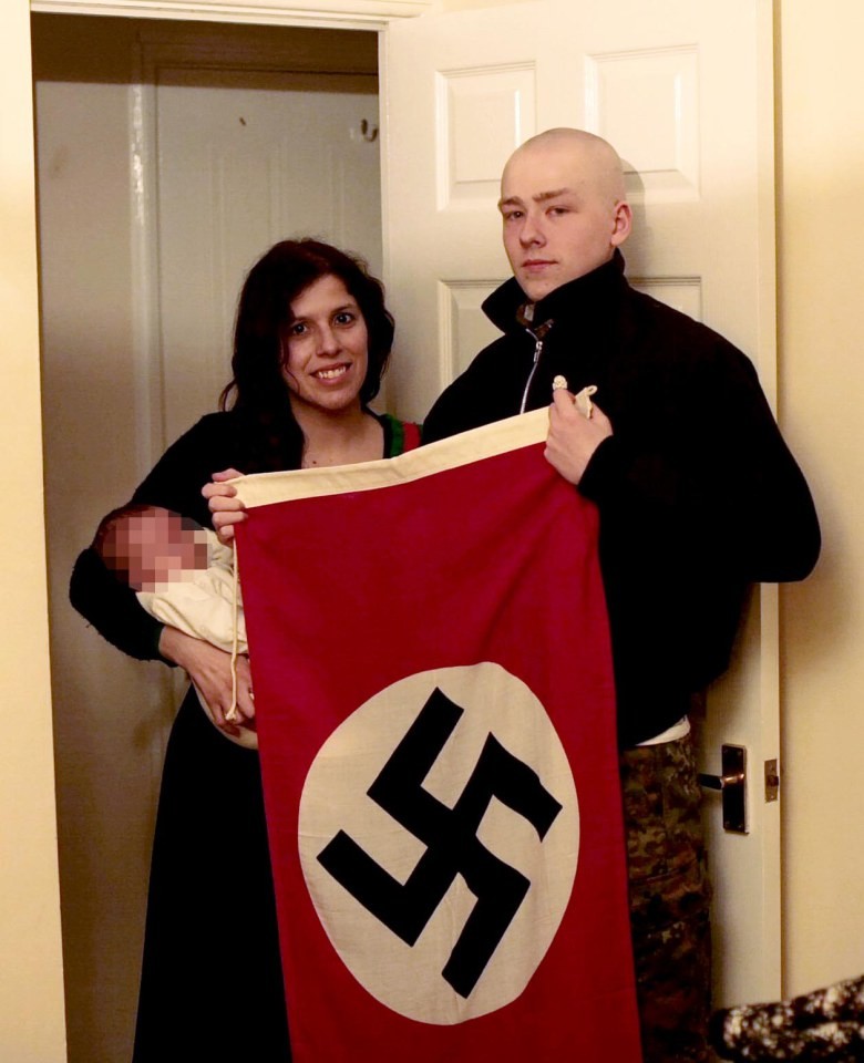 A couple, accused of being part of a banned far-right group, posed for photographs with a Nazi swastika flag while holding their newborn child, who was allegedly named after German dictator Adolf Hitler, a UK court has heard.