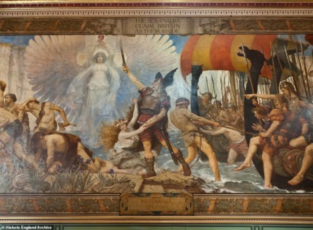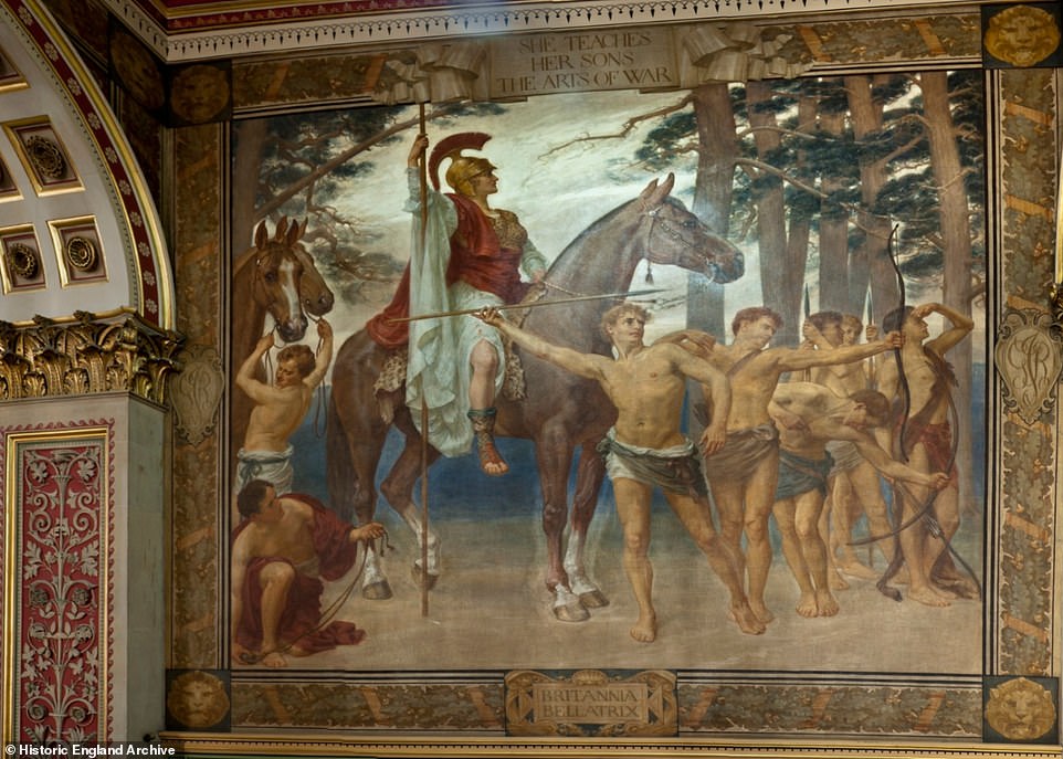 There are five murals on the staircase, entitled Britannia Pacificatrix, Britannia Sponsa, Britannia Nutrix, Brittania Bellatrix and Britannia Colonorum Mater.