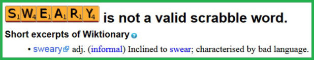 Another FYI: while “sweary” is listed in Collins English Dictionary as British slang, it is not, I repeat NOT, a word that can be used in Scrabble.
