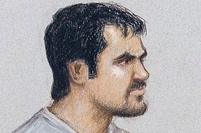 His latest trial was shown the drawing – in which the attacker is depicted shouting Allahu Akbar as blood sprays on the front door – along with a sketch of a plane hitting the Twin Towers in New York.