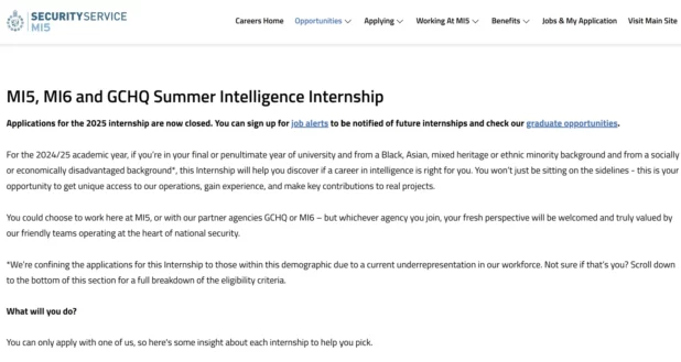 Britain’s intelligence services have been slammed for a ‘racist’ internship that doesn’t let white students apply for roles at MI5, MI6 and GCHQ.
