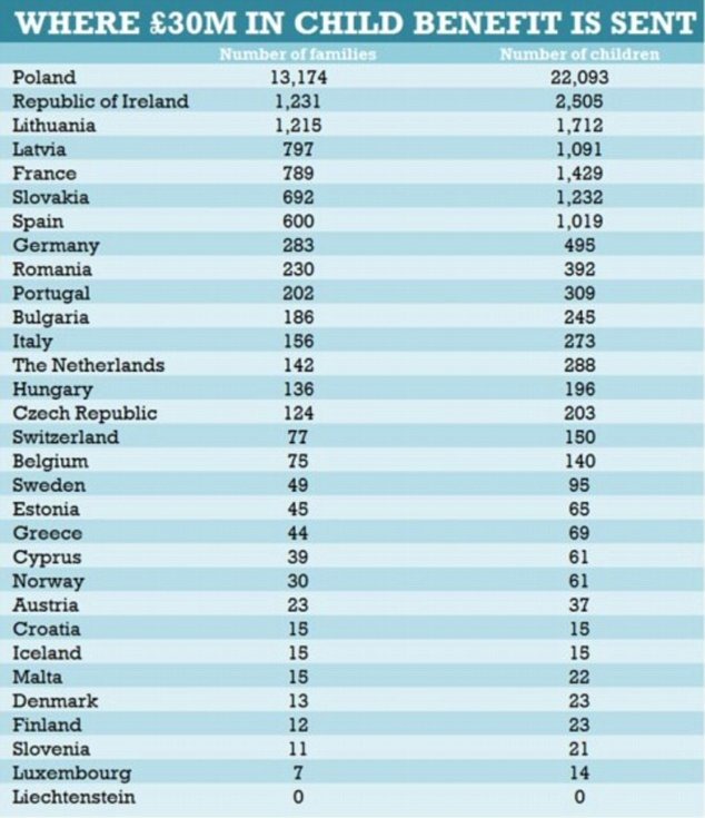 A further 1,215 in Lithuania, 797 in Latvia, 789 in France, 692 in Slovakia and 600 in Spain are all receiving child benefit from the UK Treasury.