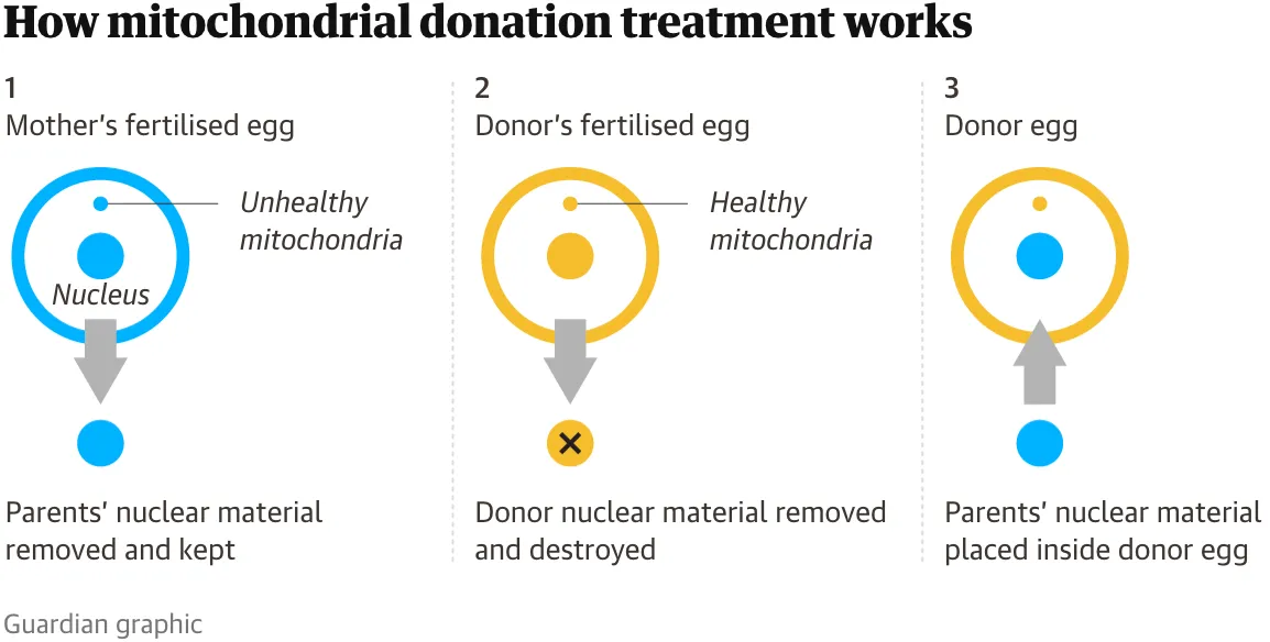The technique, known as mitochondrial donation treatment (MDT), uses tissue from the eggs of healthy female donors to create IVF embryos that are free from harmful mutations their mothers carry and are likely to pass on to their children.
