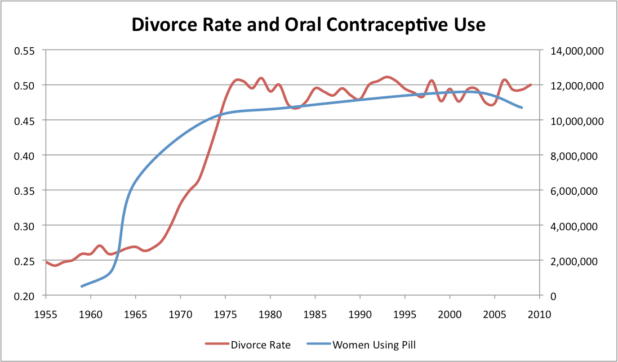 And just for the sake of reader enlightenment, here’s the divorce rate next to the birth control pill consumption rate.