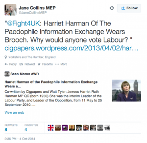 It is a shame that she was forced to apologize for the views of somebody else. It was not Jane Collins’ blog that had articles critical of the Jews on it, and the fact that Cig names the Jew should have no bearing on whether his research into Harriet Harman’s pedophile links is credible or not.