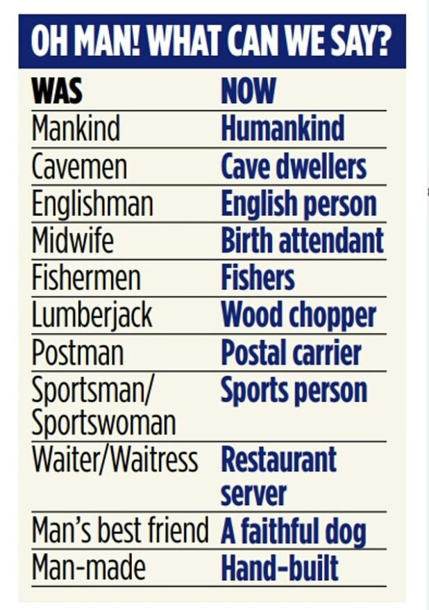 Even ‘man’s best friend’ has been blacklisted – with ‘a faithful dog’ to be used instead. And ‘birth attendant’ is suggested as an alternative to ‘midwife’.