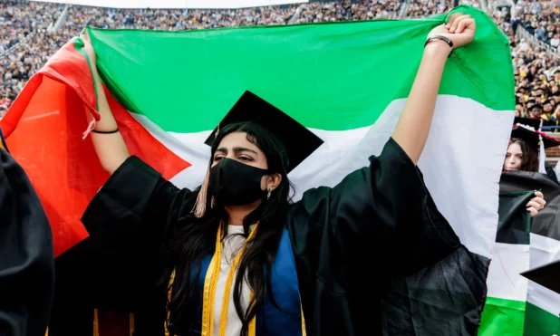 At one point, several graduates appeared to stage a walkout from the ceremony while carrying Palestinian flags and wearing keffiyehs as onlooking students applauded.