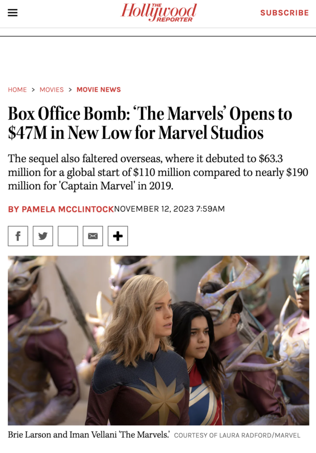 The Marvels marks a new low for Kevin Feige‘s Marvel Studio and adds fuel to the theory that superhero fatigue is a real thing as fanboys grow weary of a glut of titles and are hence far less forgiving. Marvel has been unrivaled in its success for years, with its movies collecting more than $30 billion in grosses at the worldwide box office.