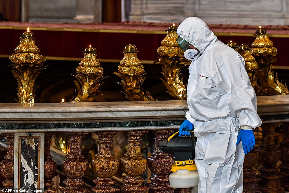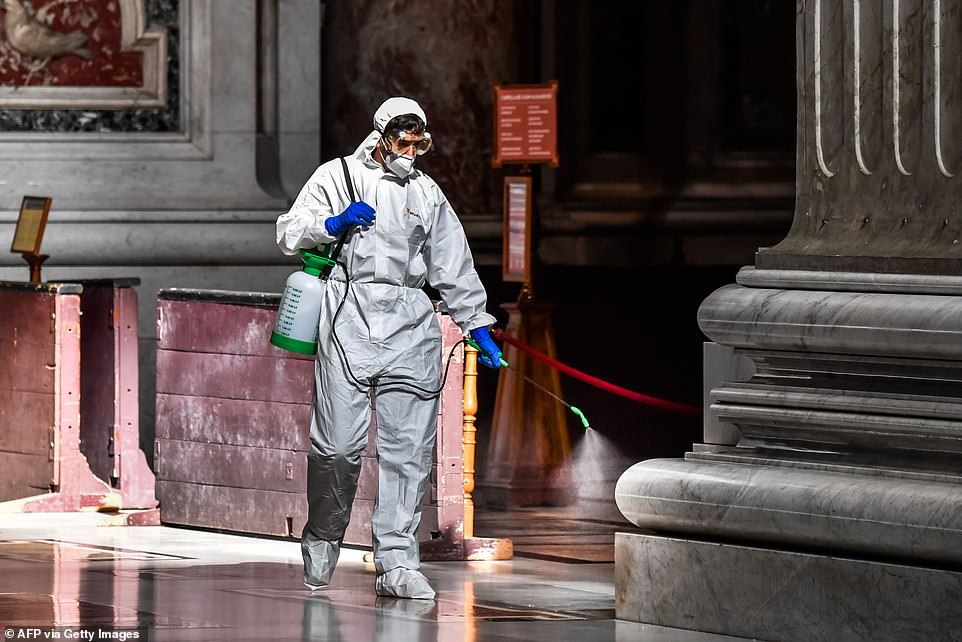 Men wearing protective overalls and masks were seen sanitising St Peter’s Basilica in the Vatican today. Workers sanitised all the statues in the basilica, including beneath the baroque sculpted bronze canopy of St. Peter’s Baldachin.