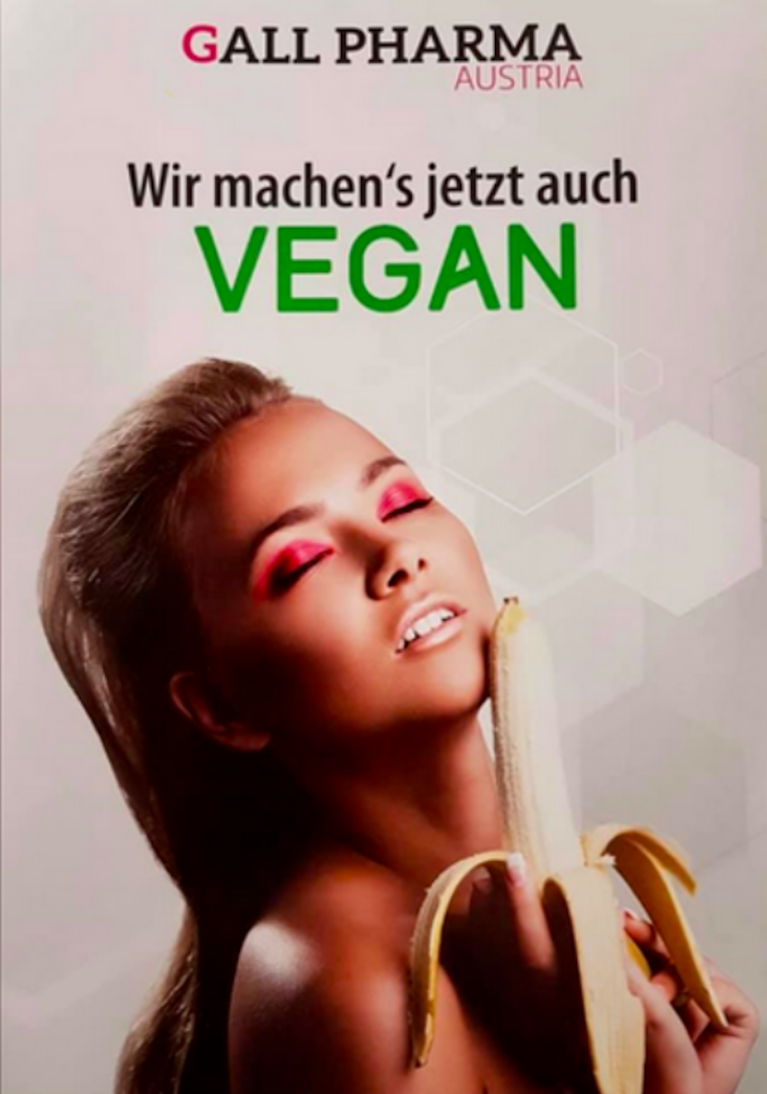 Gall Pharma rolled out a saucy ad featuring a naked woman (or so we are led to believe) suggestively resting an unpeeled banana on her chin. “We’re doing it vegan now,” the advertisement declares.
