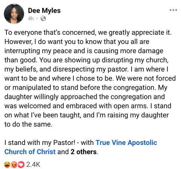 However, a woman identifying herself as the girl’s grandmother, Dee Myles, defended the church’s approach. In a Facebook comment shared by The Neighborhood Talk, Myles wrote, “We were not forced or manipulated to stand before the congregation. My daughter willingly approached the congregation and was welcomed and embraced with open arms.” Myles also expressed frustration over the public backlash, stating, “You all are interrupting my peace and causing more damage than good.”
