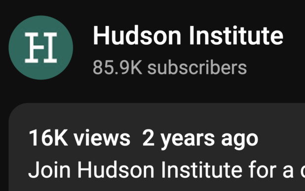 Virtually no one watches Hudson Institute streams. That video, nearly three years old, has under 20,000 views.
