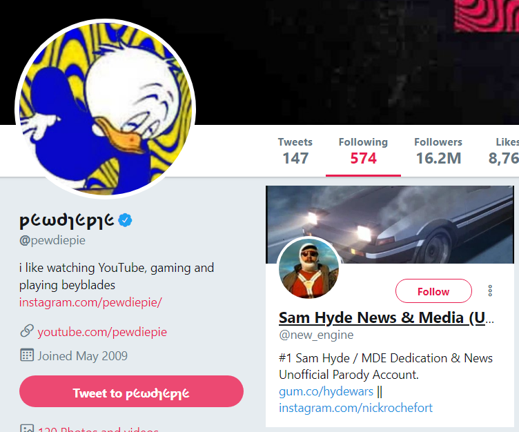 He also follows a fake Sam Hyde account on Twitter.