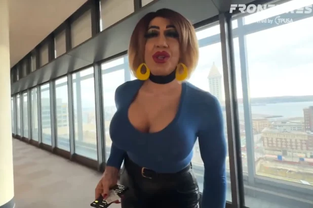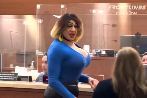 Matching the top with skin-tight black leather pants and boots, Mueller also wore an excessive amount of makeup, including dark green eyeshadow and flamboyant fake lashes as she represented “one of the far-left activists charged with disrupting a council meeting in February,” according to Choe.
