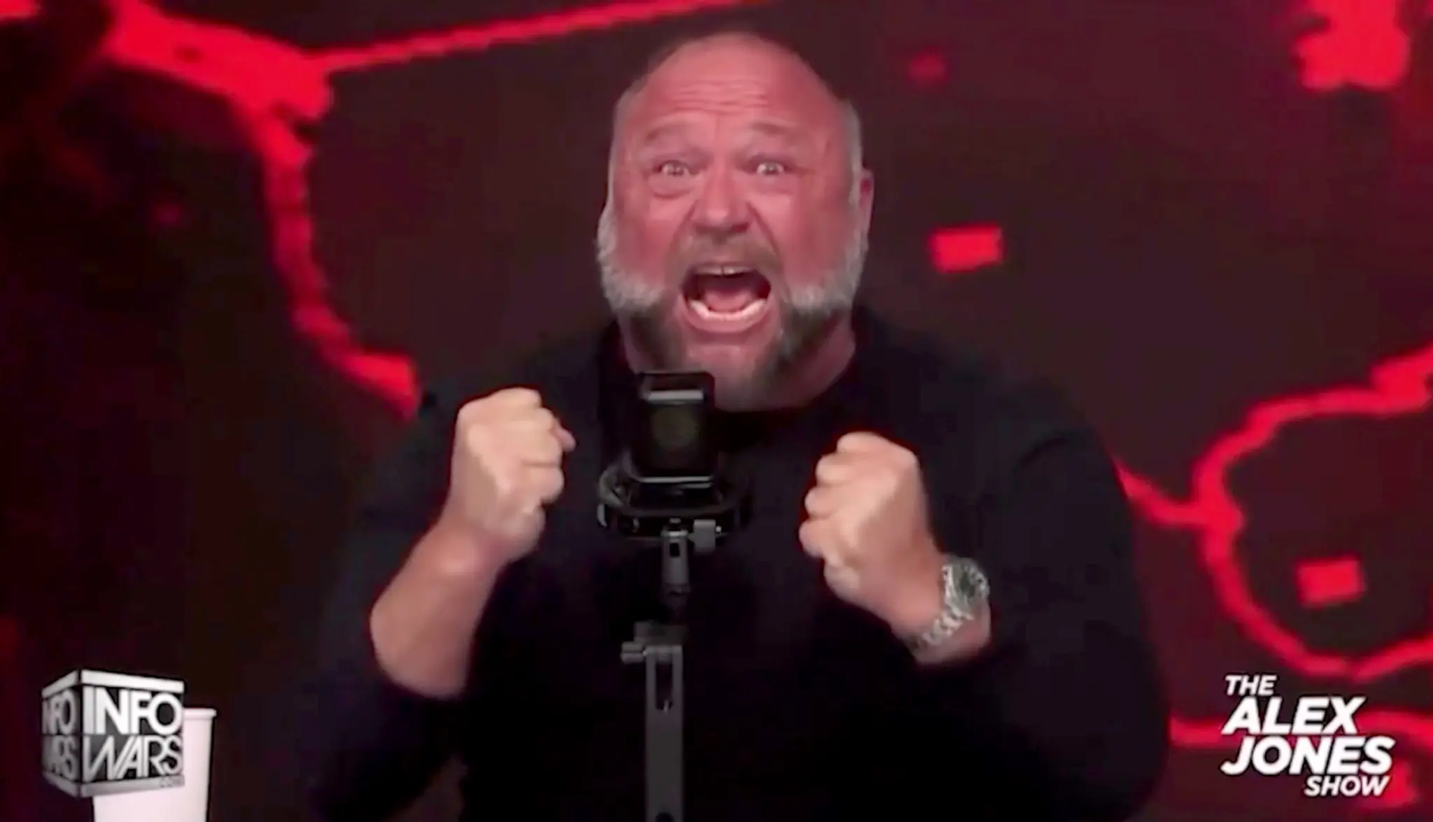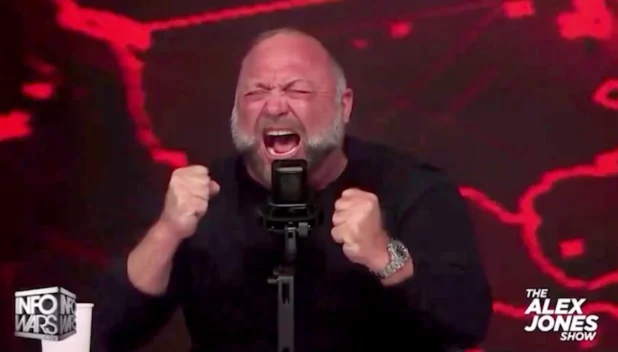 A wild clip of the moment during a so-called emergency broadcast showed Jones clenching both his fists and screaming until his face turned a dark shade of red.