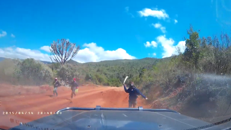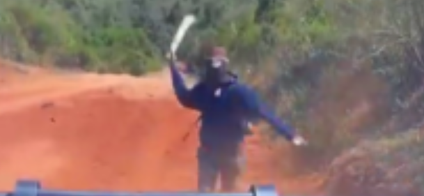 SHOCKING footage shows a group of machete-wielding bandits chasing an American couple on a dusty road in Kenya.