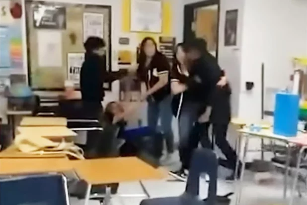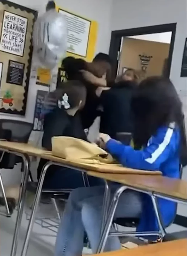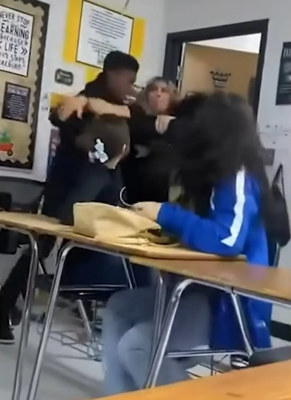 One student hurled a couple of punches at his classmate and grabbed the teacher, who inserted herself in between the students before he threw her aside and unleashed several more punches.