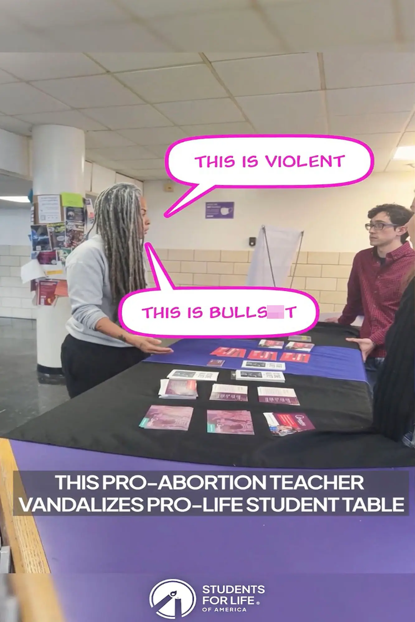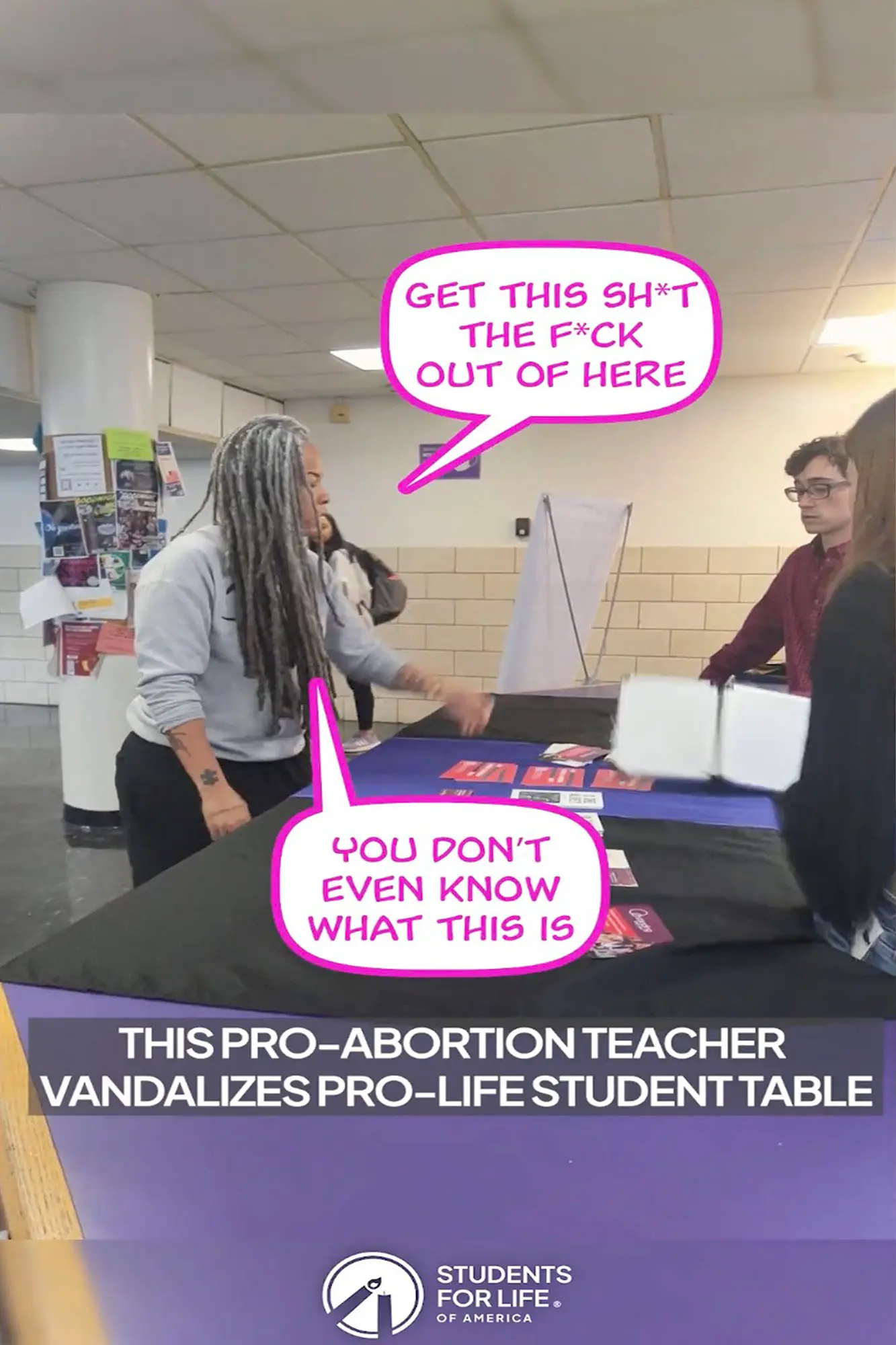 She then pushed the anti-abortion materials off the table toward the students while exclaiming “f–k this s–t” and walked off, according to the footage.