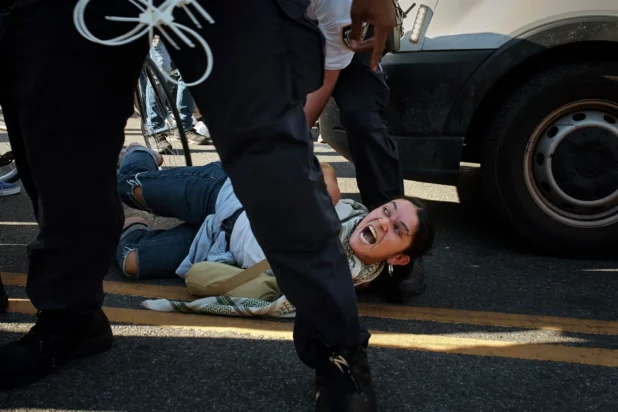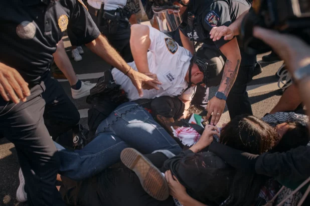 🚨BREAKING: NYPD seen punching Pro-Palestine protestors as they tackle them to the ground for standing in the street in front of the Brooklyn Museum.